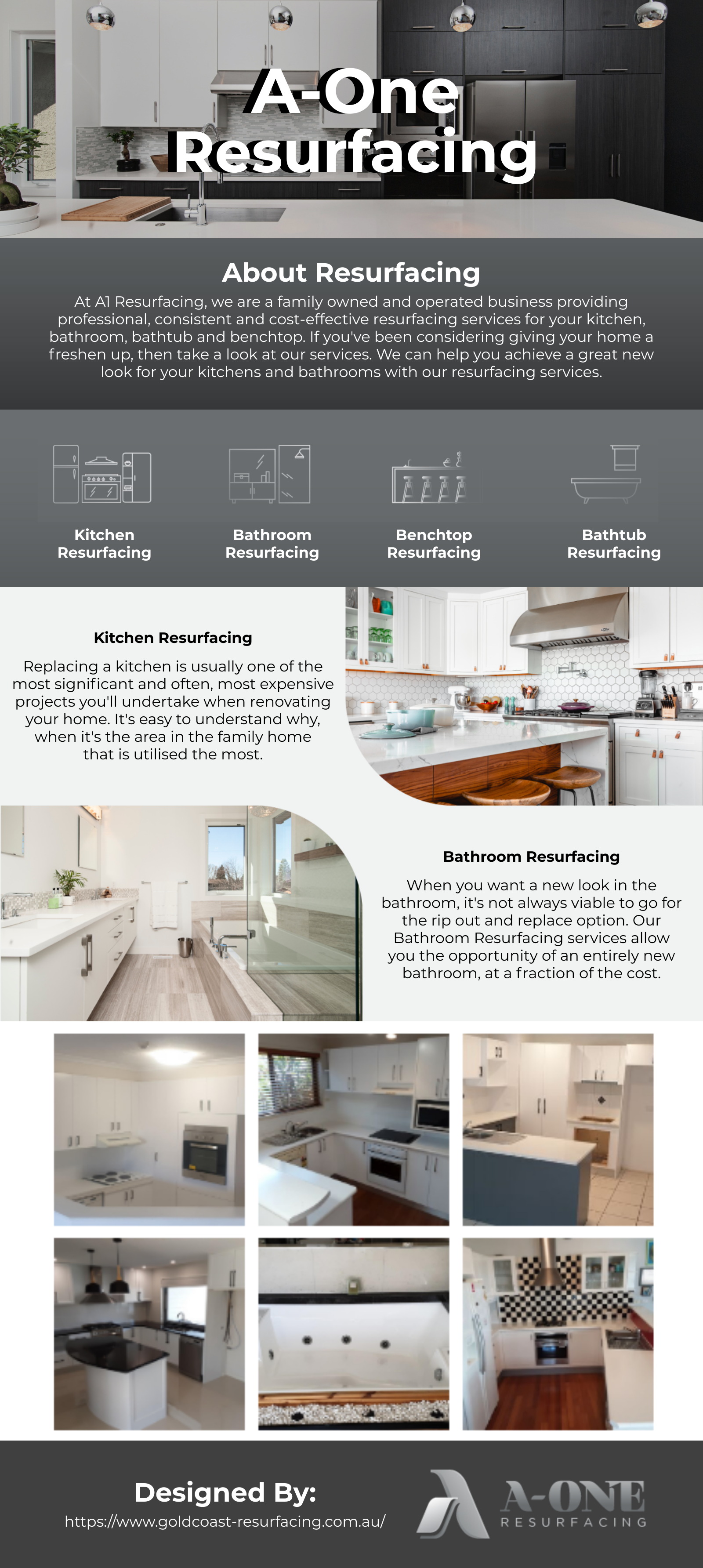 At A1 Resurfacing, we are a family owned and operated business providing professional, consistent and cost-effective resurfacing services for your kitchen, bathroom, bathtub and benchtop. If you've been considering giving your home a freshen up, then take a look at our services. We can help you achieve a great new look for your kitchens and bathrooms with our resurfacing services. A1 Resurfacing offers a high quality and hassle free option when it comes to renovating your home.